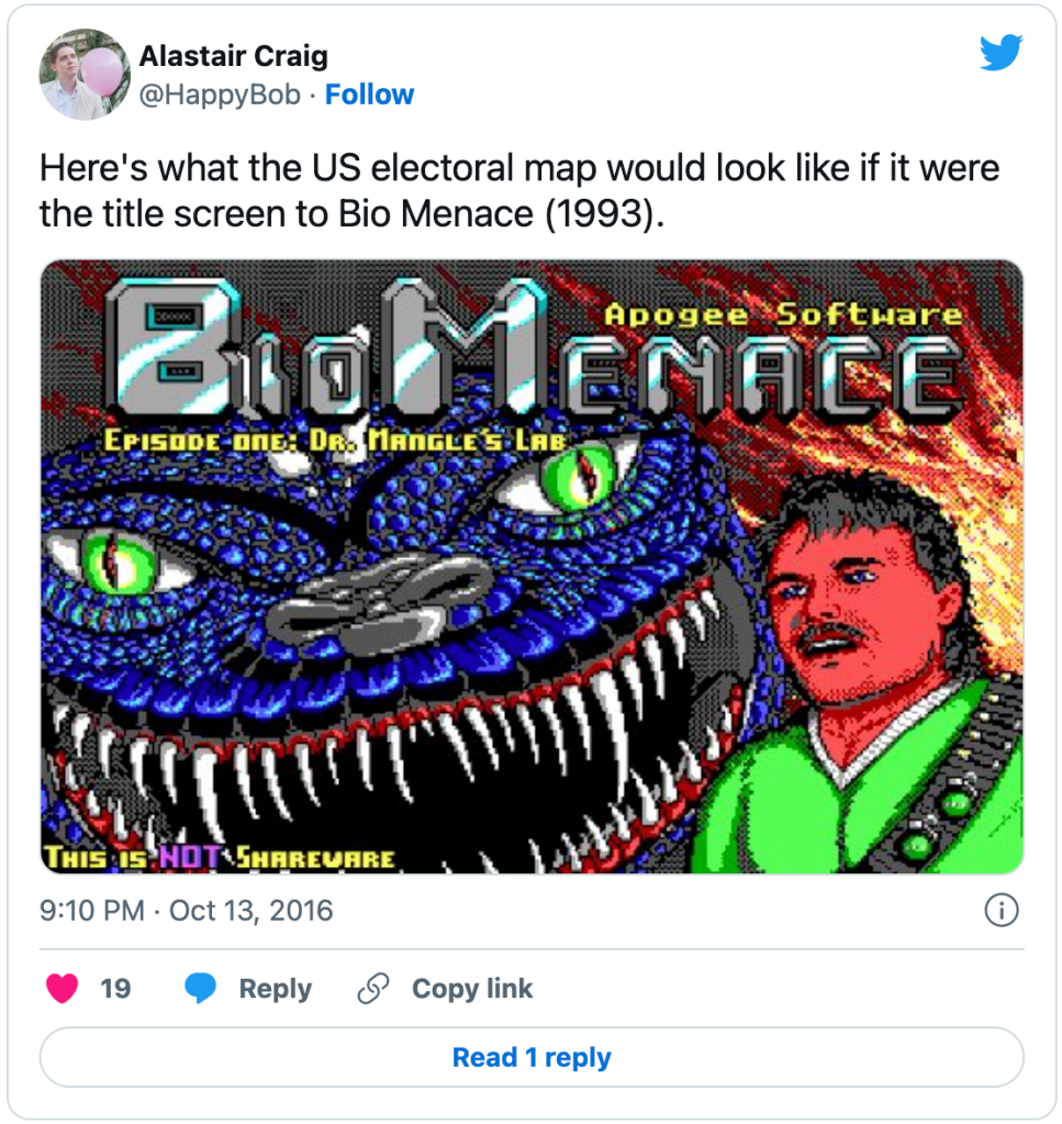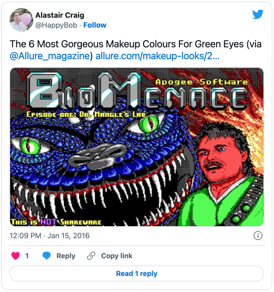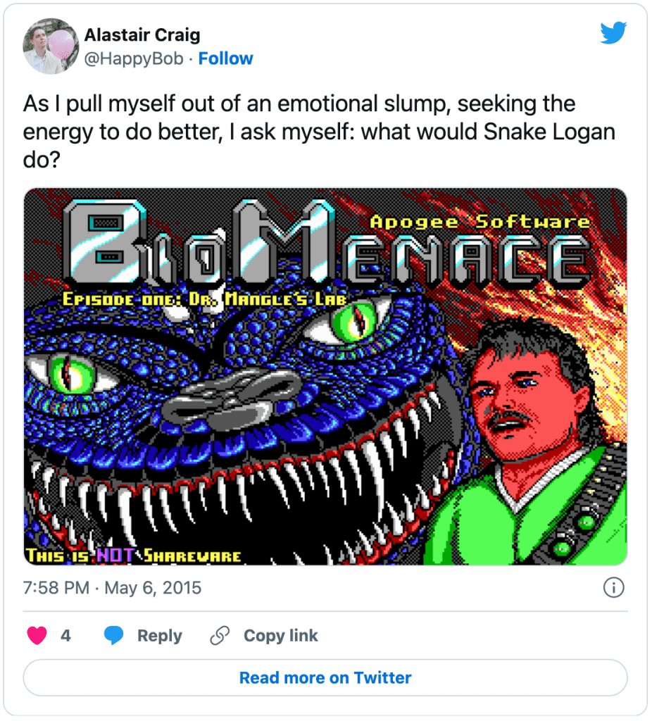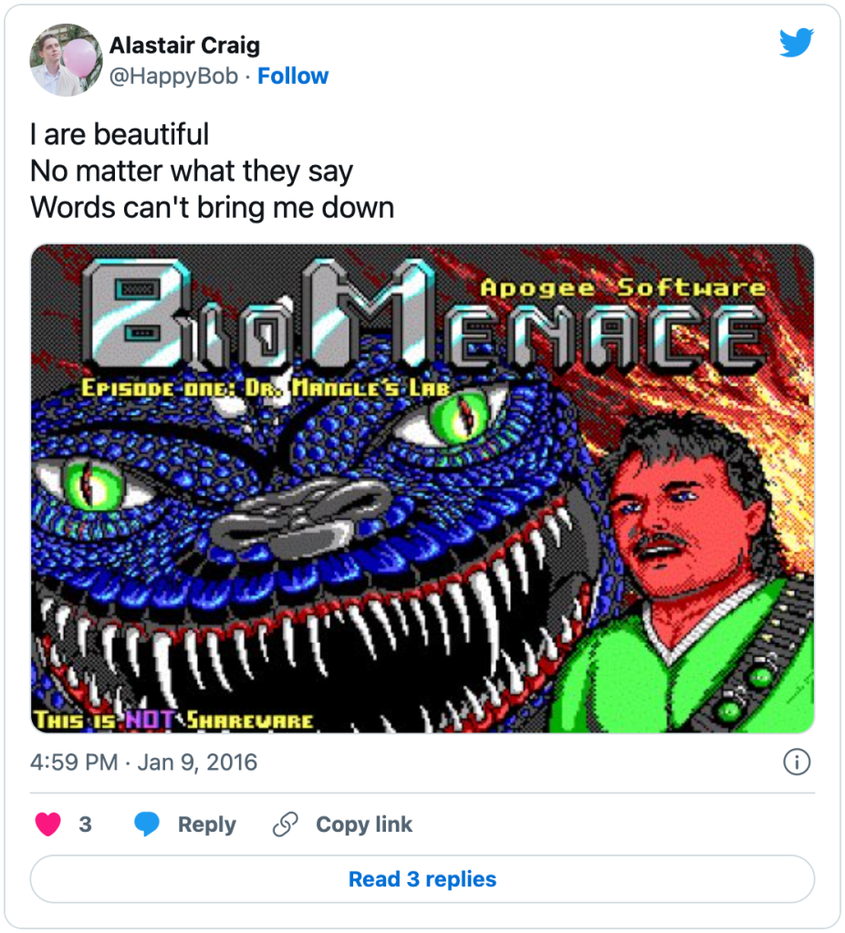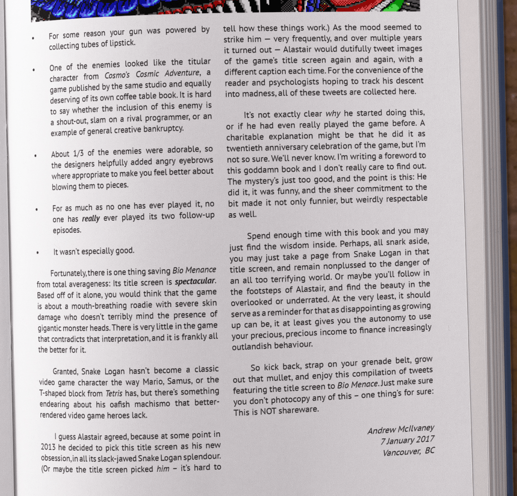 Since that fateful night, a small but ever-vigilant part of my brain has remained on standby over the years, doggedly scanning the world for every flimsy pretence to tweet out the title screen to Bio Menace.